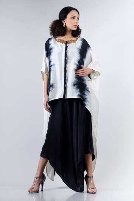 Black & white kaftan top with high-low hem & placement hand couching-dori embroidery. Comes with inner crop top & draped asymmetric pants.