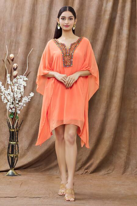 Coral orange kaftan with bugle beads and mirror work on the yoke.