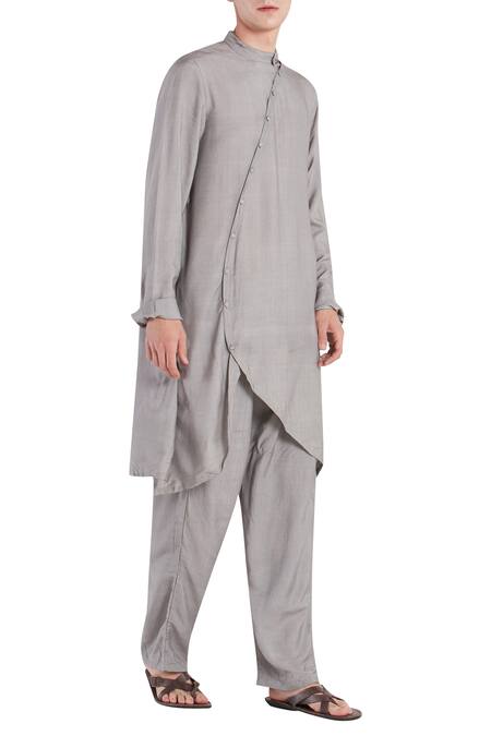 Son Of A Noble Snob_Grey Cotton Silk Plain Asymmetric Kurta Set_Online_at_Aza_Fashions
