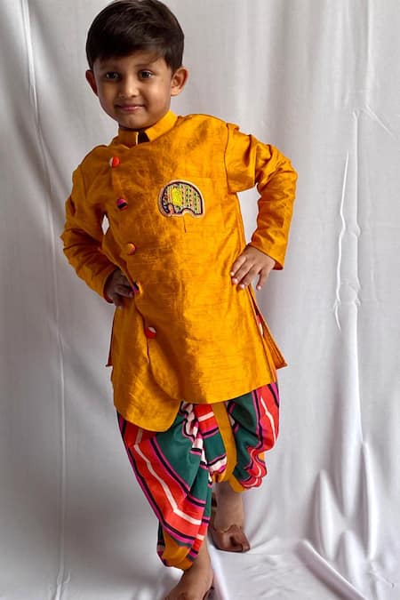 Yellow asymmetric kurta featuring full sleeves and placement embroidered detail. Paired with striped dhoti pant for a complete look.