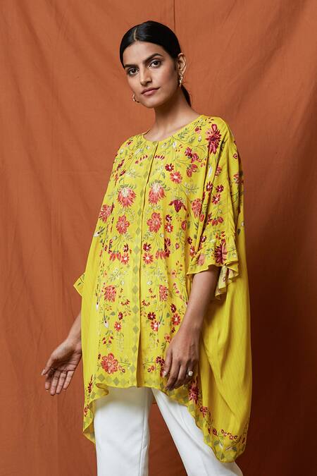 Bumblebee yellow short tunic with all-over floral motif work, ruffle sleeves & asymmetric hem.