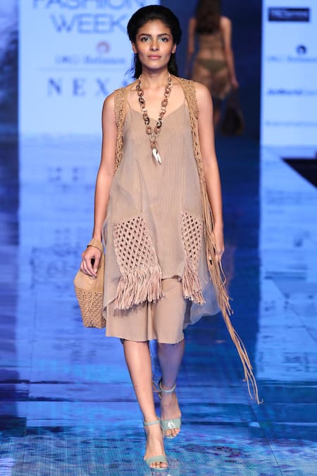 Beige layered dress with high-low hem, all-over striped detail & tassel detail.