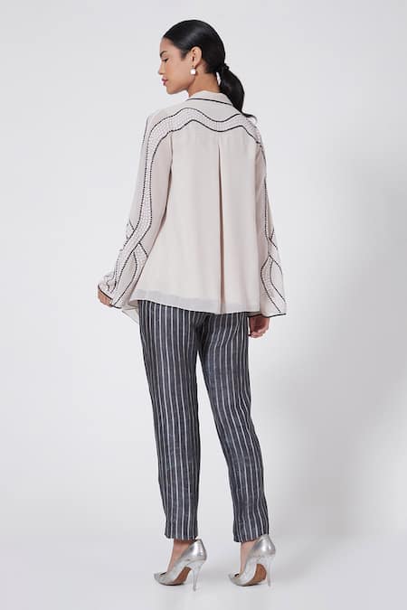 Contrast applique detailing on sleeves, Pleated back design, Sequin embellishments along the sleeves