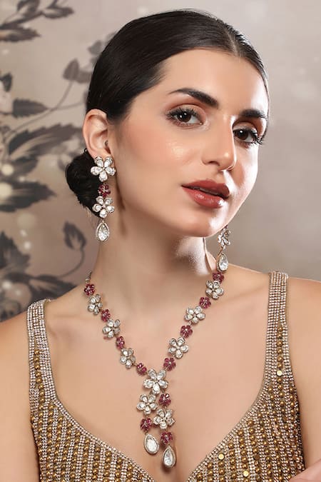 Designer necklace set featuring a floral shaped pendant adorned with kundan and ruby red stone embellishments. Paired with matching earrings that complement the necklace's design.