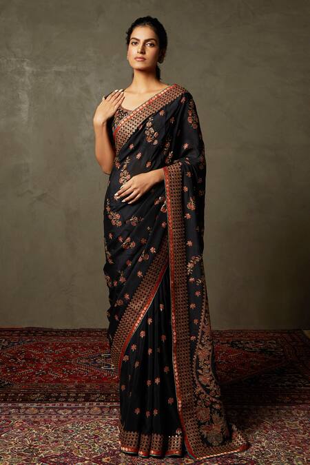 Black saree featuring floral printed motifs and aari work. Comes with an unstitched blouse piece.