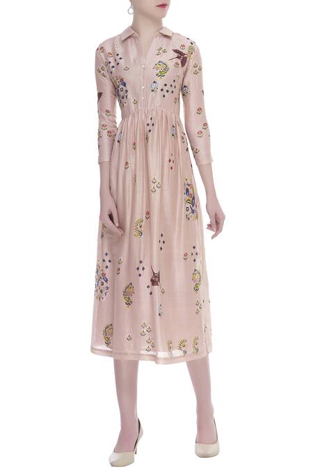 A pretty peach cotton midi shirt dress is accentuated with hand embroidery all over the pleated flare dress.