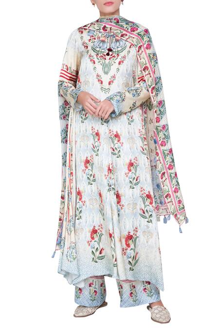 The Avisa set is a breezy choice with delicate blooming motifs printed all over the blue bodice. Paired with matching dupatta and light trouser bottoms.