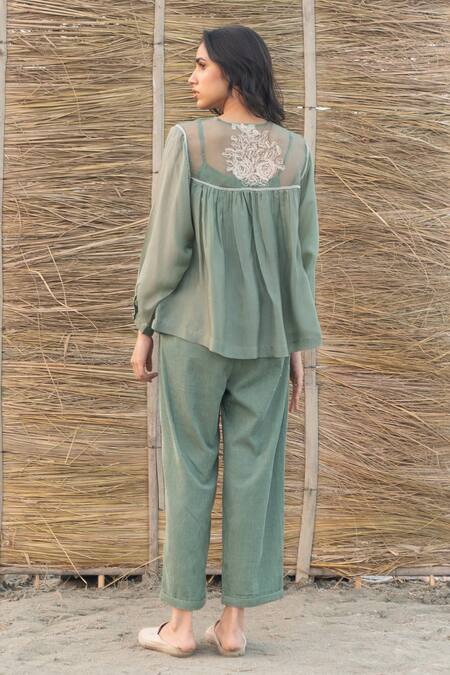Green top featuring floral hand embroidery on silk organza patch at the yoke