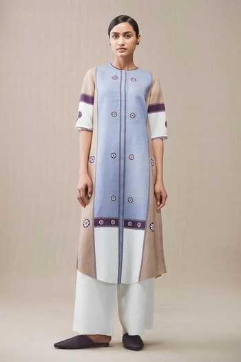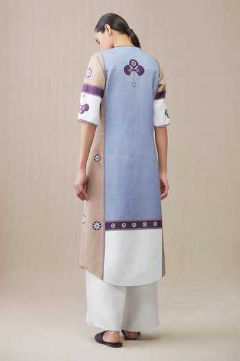 Taupe, blue tunic with floral motifs & contrast panels. Paired with linen palazzo.