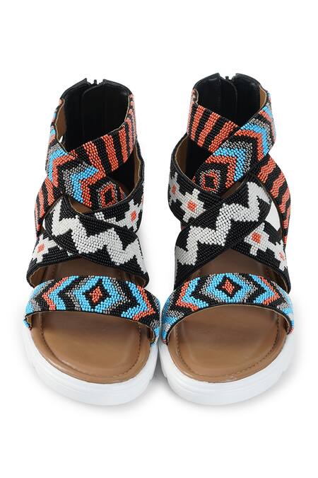 Aztec bead embroidery on straps, Round toe design, Lightweight PU leather composition