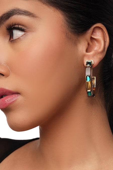 18Kt gold plated hoop earrings crafted with placement geometric motifs, green crystal embellishment, resin accents & black enamel details.