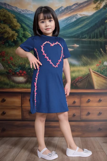 Blue dress featuring heart-shaped embroidery with pink detailing