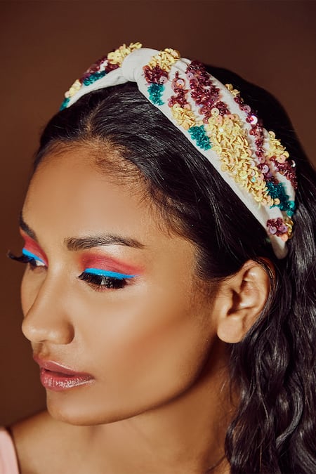 Multi-color sequin embellishments in a striped pattern, Turban-style design for a chic look, Centre fabric trim for added elegance