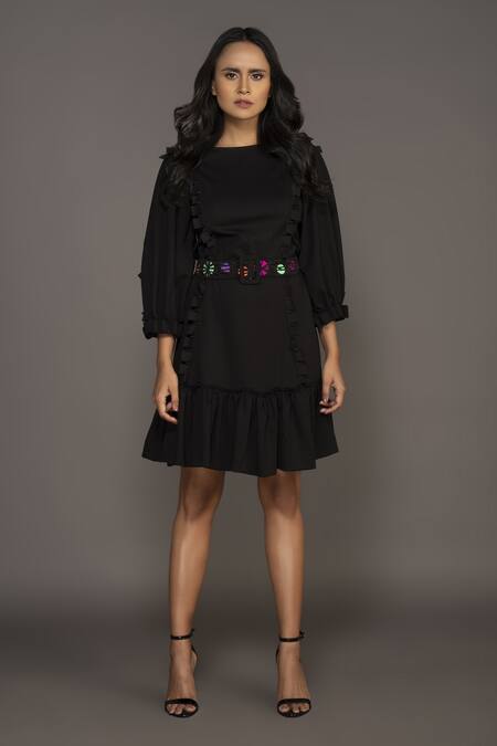 Black ruffle bottom backless dress with cutwork detailing. Comes with a belt.