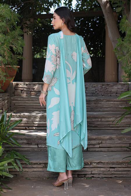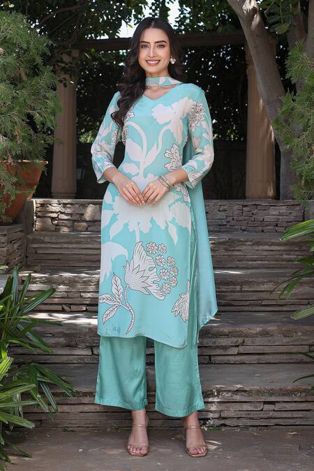 Turquoise straight kurta with contrast floral patterns. Comes with pant & choker dupatta.