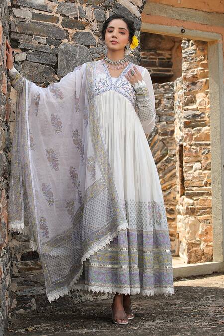 Buy_Bairaas_Blue Anarkali Mul Cotton, Dupatta Kota Doria Block Print, Floral With_Online_at_Aza_Fashions
