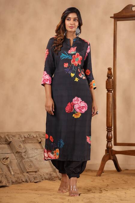 Black kurta with floral pattern & mandarin collared neckline. Paired with salwar.