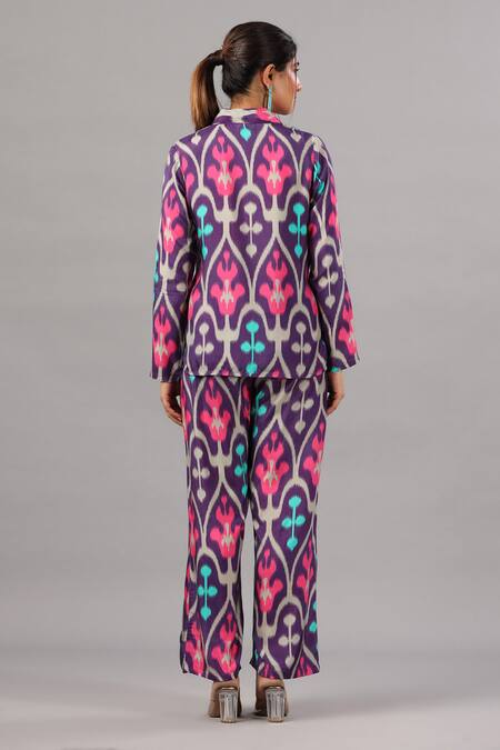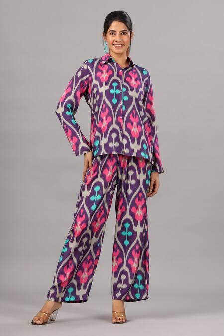 Purple shirt with front buttons & flower print. Paired with printed pant.
