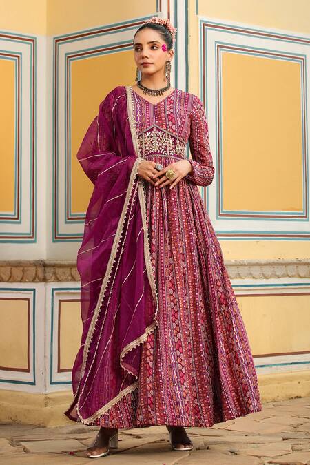 Purple geometric printed anarkali with embellished waistband Paired with organza gota work dupatta.