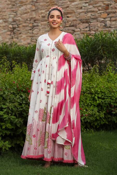 Pink hand block printed anarkali with mirror handwork. Paired with tie dye dupatta.