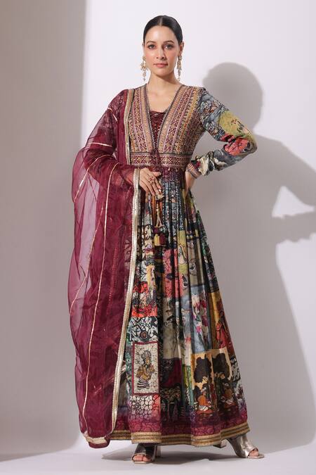 Buy_Bairaas_Maroon Anarkali Dola Silk Printed Persian Art Blunt V With Dupatta