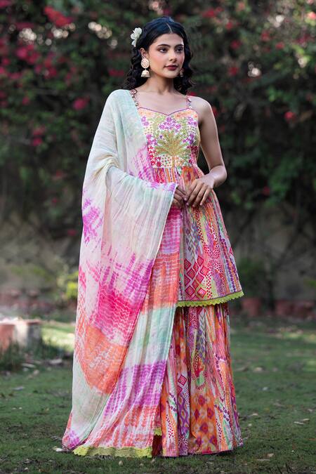Pink coconut tree embroidered short kurta with lace border. Paired with sharara and dupatta.