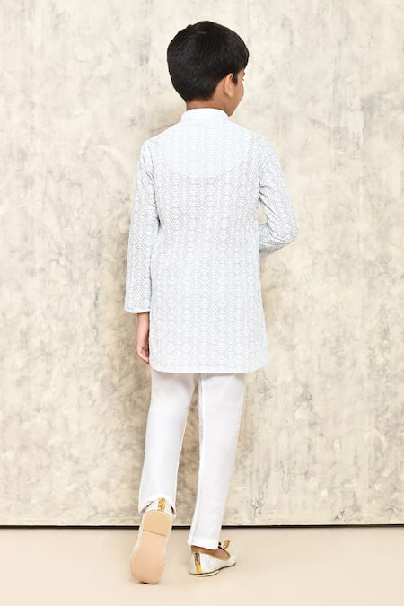 Sky blue kurta featuring full sleeves and a mandarin neckline with floral jaal pattern chikankari embroidery