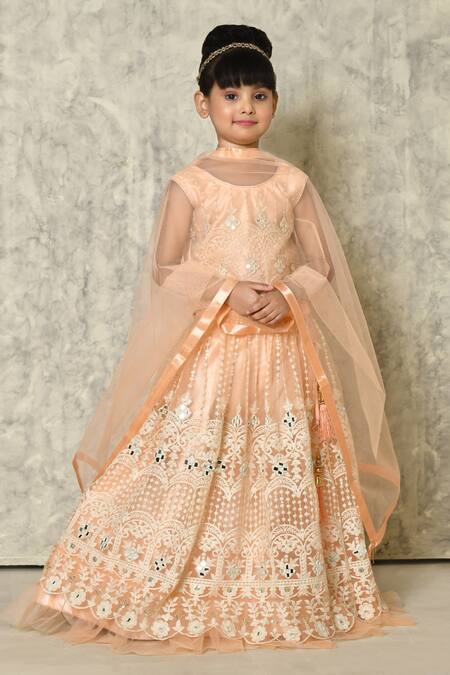 Peach Net Embroidery, Mirrors Work Embellished Lehenga Set