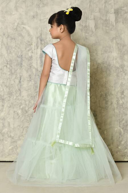 White sequin embellished blouse featuring floral jaal motifs. Paired with a mint green plain tiered lehenga and tasselled dupatta.