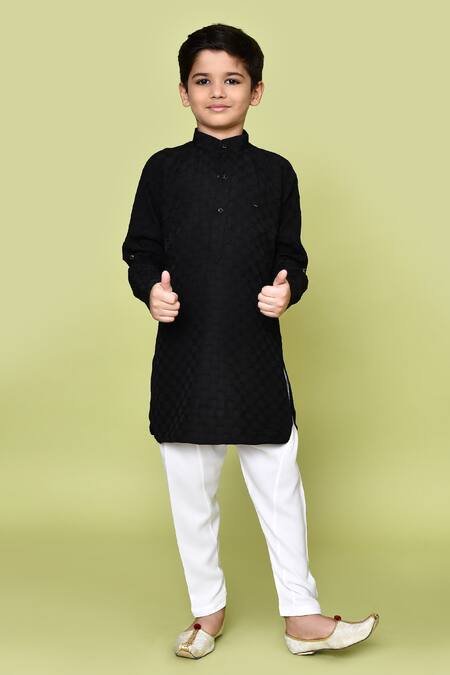 Black jacquard pathani kurta featuring a front buttoned placket and checkered woven pattern. Paired with white cotton rayon pyjama with an elasticated waistband.