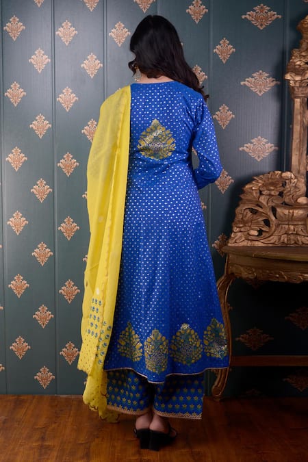 Royal blue anarkali with floral foil print and lace trim on the neckline and sleeve hems. Comes with palazzo and lemon yellow chanderi dupatta.