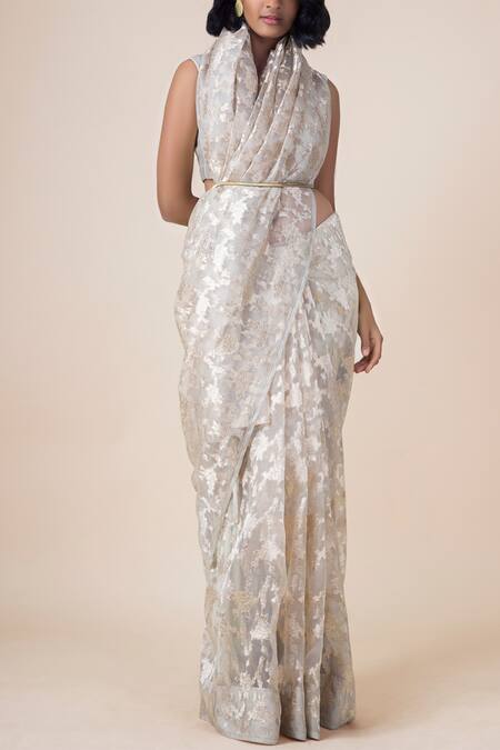 Off white organza saree with banarsi cutwork detail. Comes with running blouse fabric.