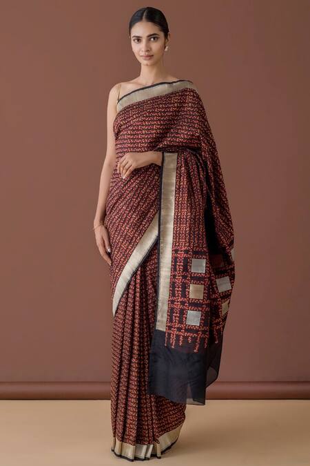 Brown silk saree with geometric motifs on pallu border. Comes with running blouse fabric.