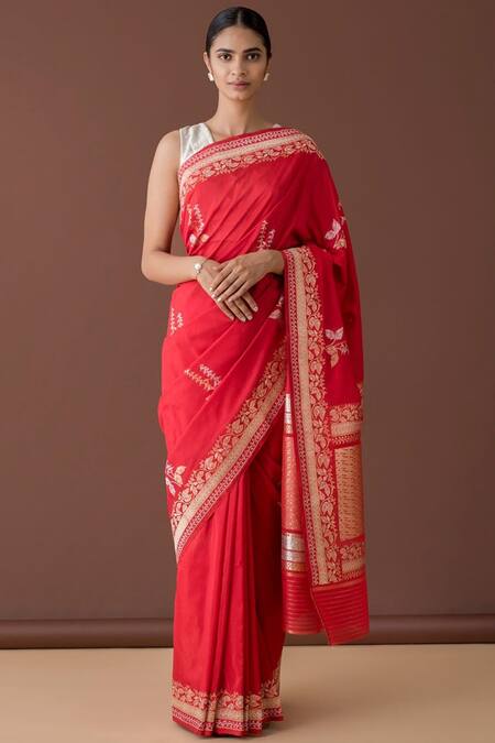 Red silk saree with floral motifs all over. Comes with running blouse fabric.