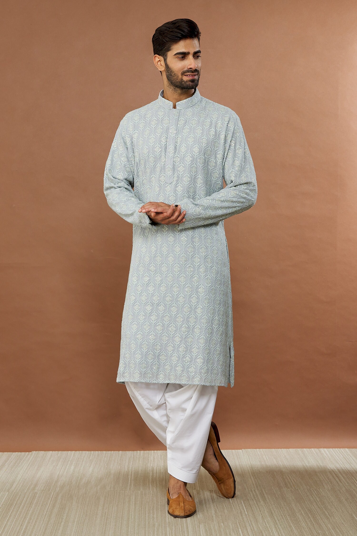 Grey kurta featuring floral embroidery highlighted with sequins. Paired with a white patiala pant.