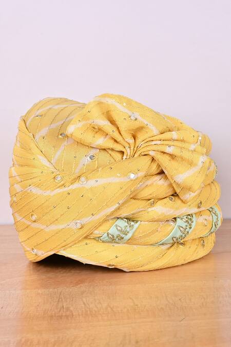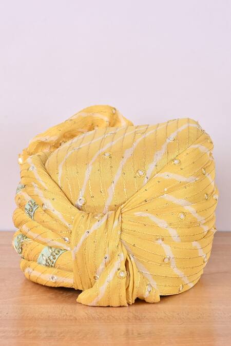 Lemon bandhani safa with thread, sequin and mirror embroidery and contrast embroidered trims.