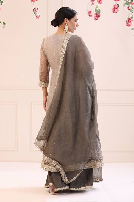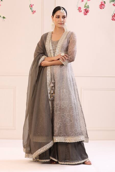 Grey anarkali with all-over bandhani prints in floral pattern. Comes with sharara and dupatta.