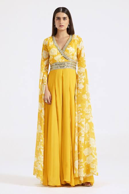 Hand-embroidered neckline with intricate cutdana and zari work, Cascading cape sleeves for added elegance, Attached embroidered belt enhancing silhouette