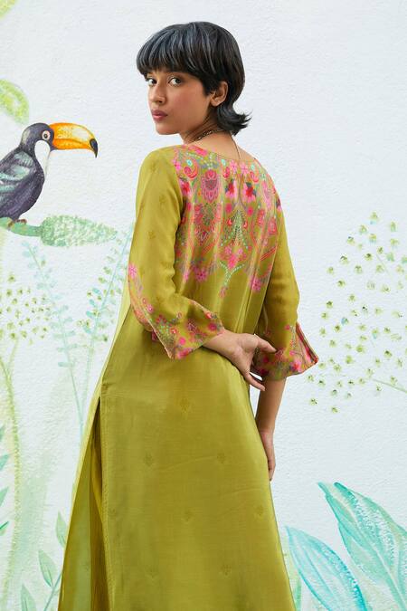 Green kurta featuring floral prints with embroidered placket detailing and tassels. Paired with matching pant and dupatta, designed in natural fibre crepe with side slits.