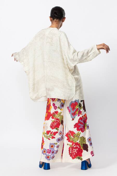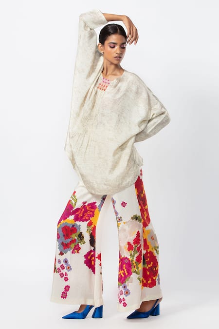 Ivory top in a silk base, with multicolor thread and mirror embroidery at the neckline and full length batwing sleeves.