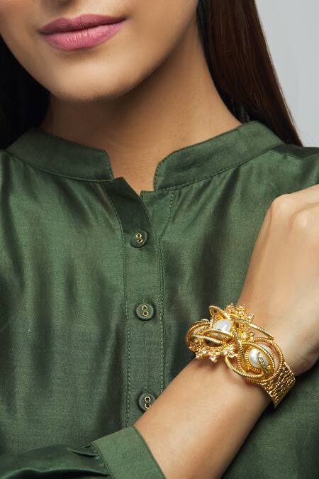 Gold polished overlapping bracelet with crystals & bead centre piece.