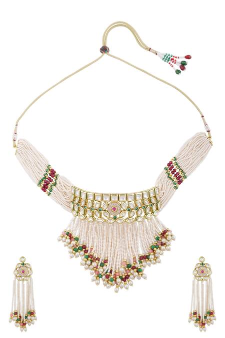 Multi pearl bead string choker with kundan center. Comes with matching earrings.