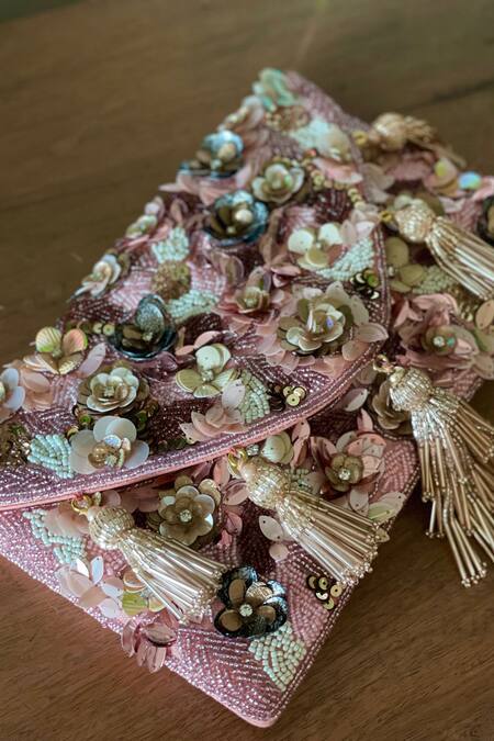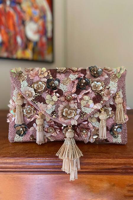 Pink clutch bag featuring 3D floral appliques and beaded tassel drops