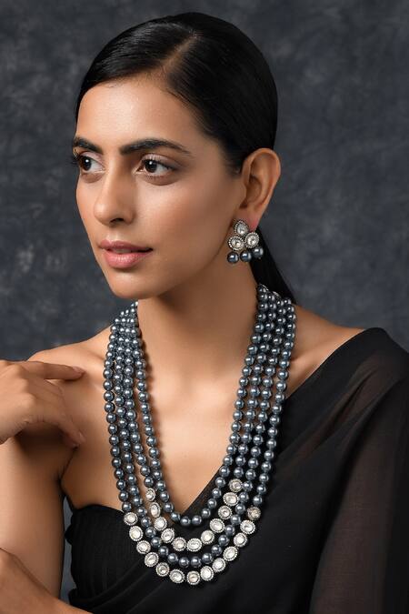 Rhodium plated layered necklace with encrusted polki, faux diamonds & multi-pearl strings. Comes with stud earrings.