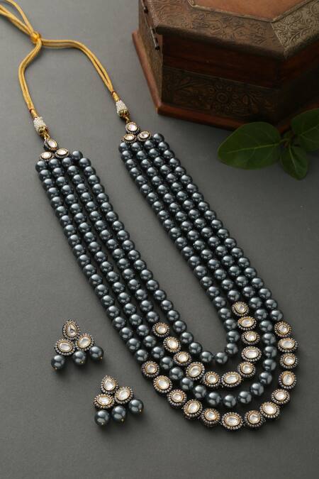 Silver Plated Pearl, Polki, Faux Diamonds Bead Layered Necklace Set