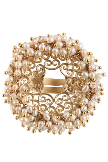 Gold-plated ring with pearl beads & filigree cutout pattern.