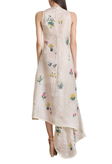 A beige high neck sleeved-less dress based in organza featuring multi-colored floral 3D hand applique work. It is enhanced with a high low hemline. It fits true to its style.
