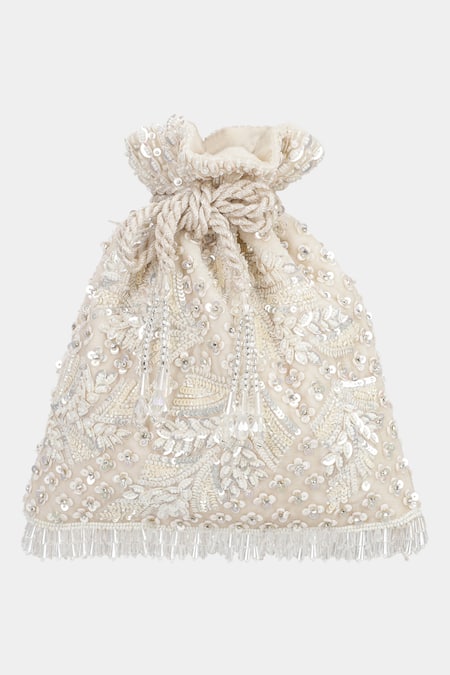 Ivory potli bag featuring floral and leaf pattern embroidery with crystal tassel hem