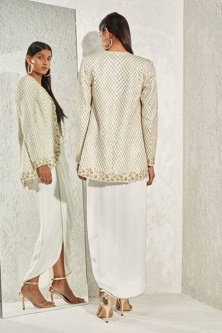 Ivory Satin Embroidery Belladonna Embellished Jacket And Draped Skirt Set