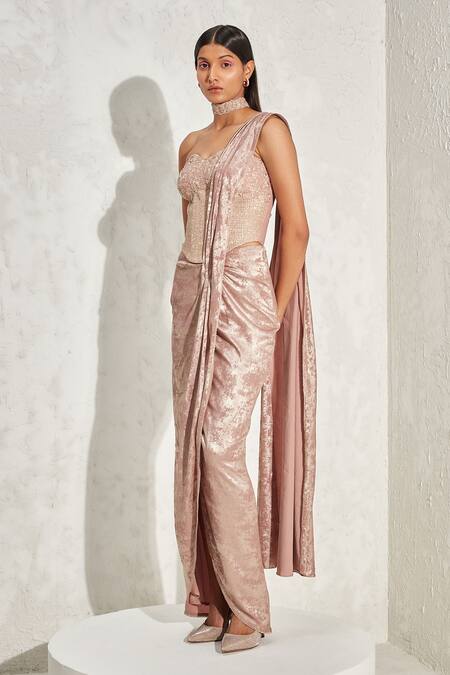 Rose gold pre-draped saree in shimmer crepe base, geometric hand embellishments. Comes with corset top.